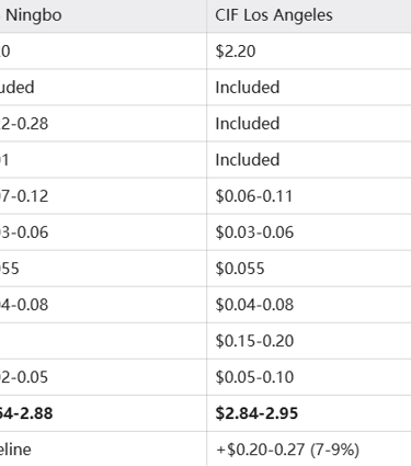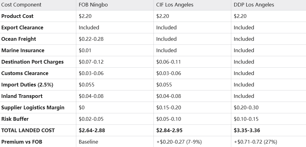Hidden costs matter: FOB $2.20 can become $2.85+ with unexpected fees. Always calculate total landed cost, not just quoted price.