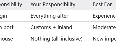 DDP maximizes simplicity and speed: Highest cost but zero hassle. Perfect for new importers, time-sensitive orders, or when you want to focus on sales rather than logistics.