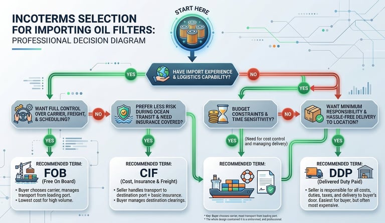 Complete guide to FOB, CIF, and DDP Incoterms for importing oil filters from China. Real cost breakdowns, risk analysis, and decision framework to save 20-40% on shipping costs